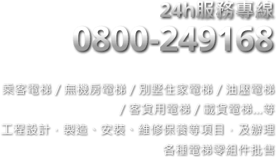 專營各式電梯(乘客電梯/無機房電梯/別墅住家電梯/油壓電梯/客貨用電梯/載貨電梯...等 之工程設計.製造.安裝.維修保養等項目及辦理各種電梯零組件批售 。